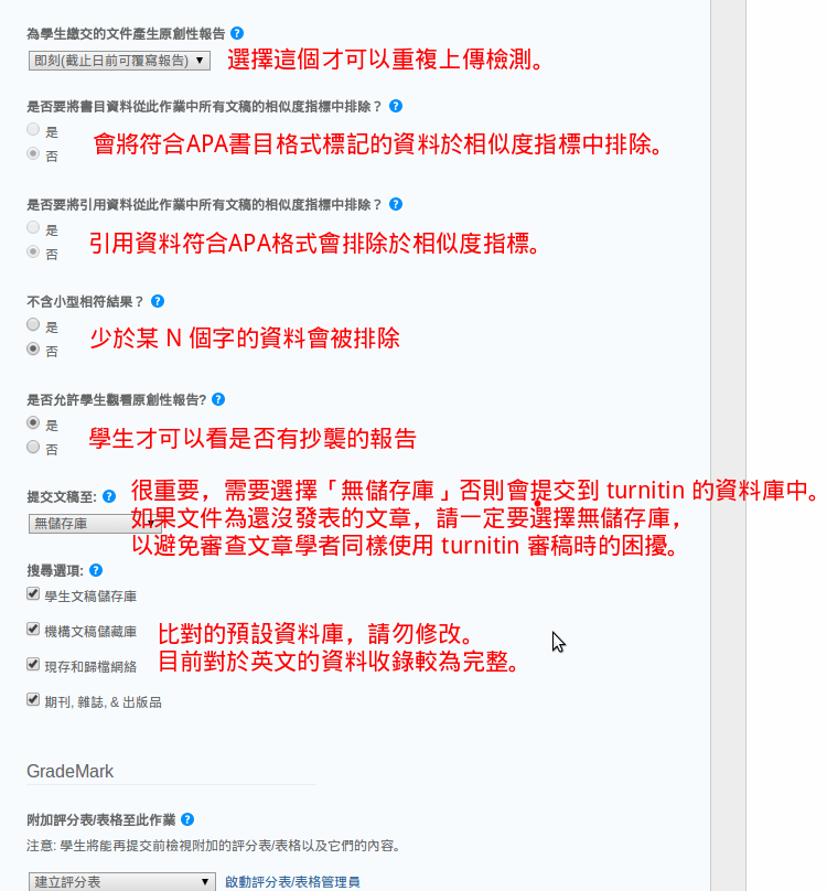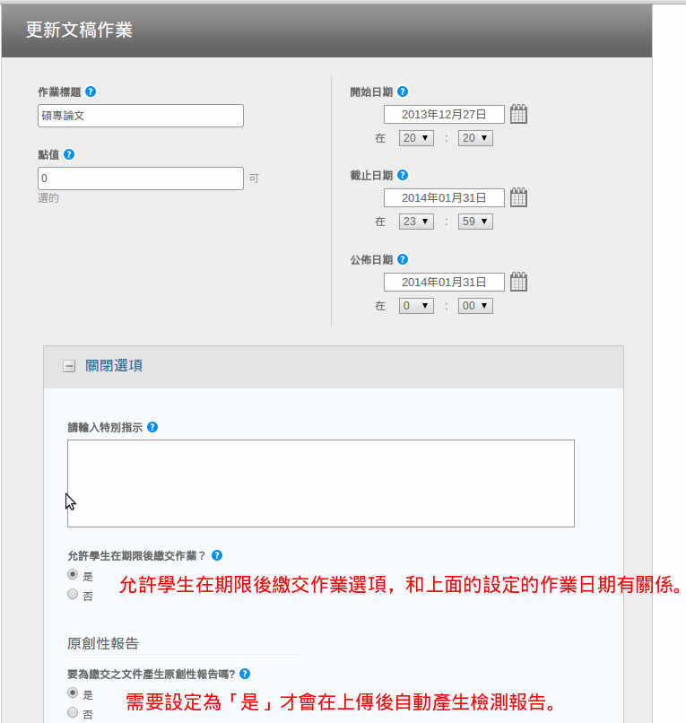 論文檢測請參考上述投影片之設定,底下內容為說明及其他進階助教模式的設定說明。